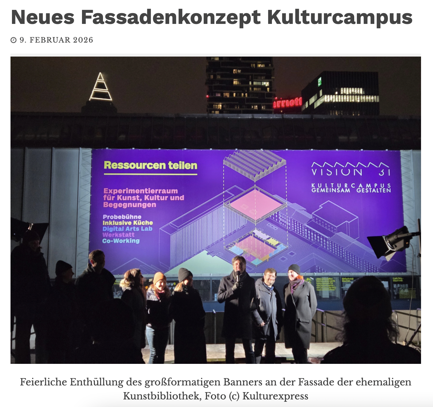 Feierliche Enthüllung des großformatigen Banners an der Fassade der ehemaligen Kunstbibliothek.”
